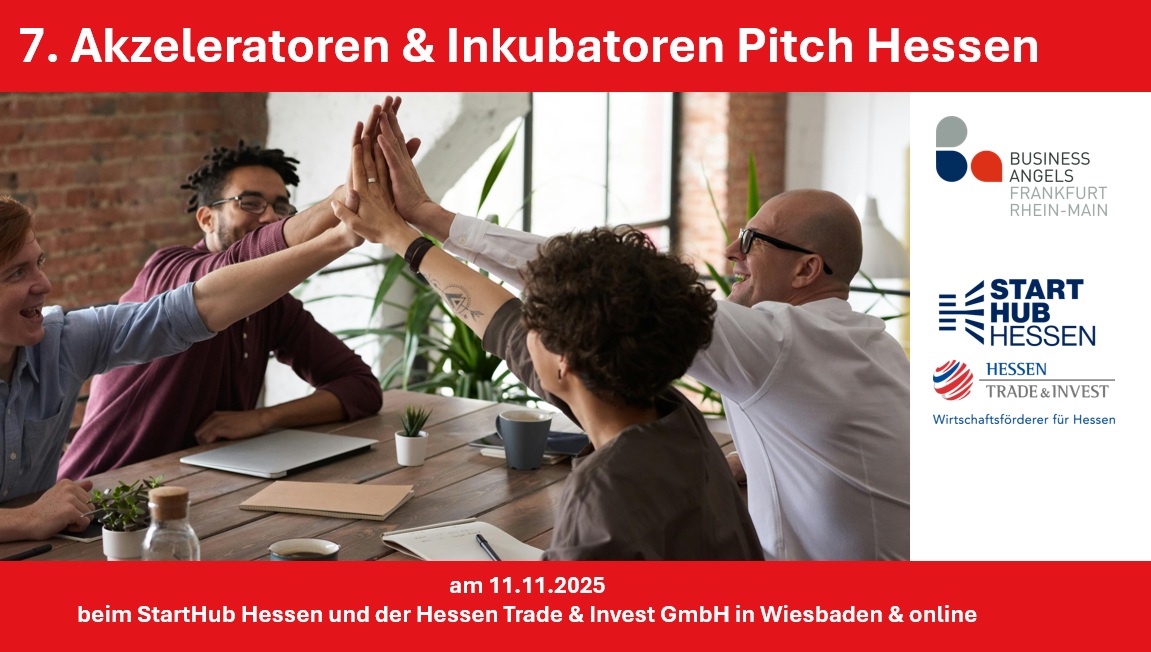 Veranstaltet wird der Akzeleratoren & Inkubatoren Pitch vom Business Angels FrankfurtRheinMain e.V. und dem StartHub Hessen der Hessen Trade & Invest (HTAI).