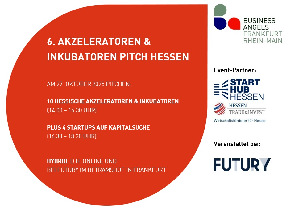 Am 11. November 2025 findet der 7. Akzeleratoren & Inkubatoren Pitch Hessen mit 10 weiteren Akzeleratoren und Inkubatoren in Wiesbaden statt.