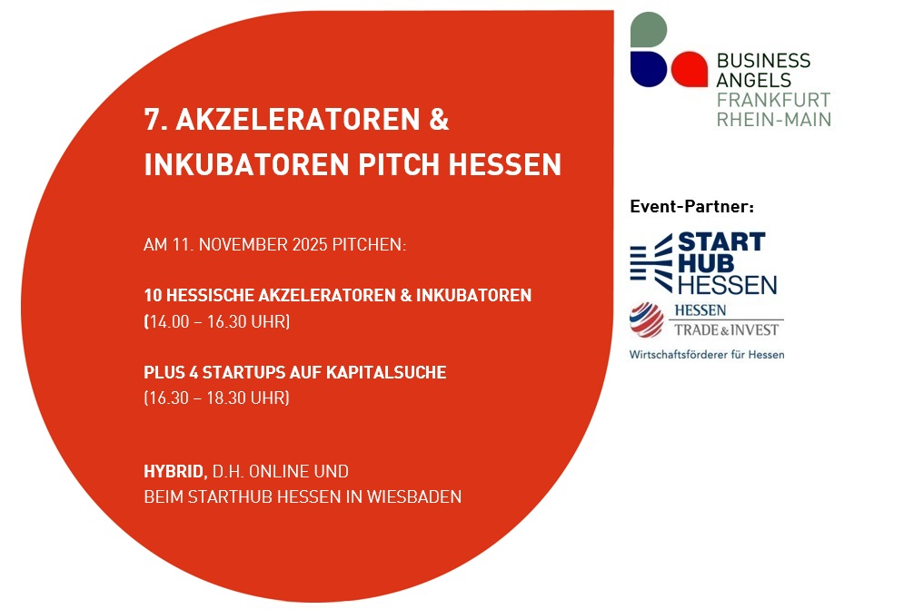 Bereits am 27.10.2025 findet der 6. Akzeleratoren & Inkubatoren Pitch Hessen hybrid in Frankfurt und online mit 10 weiteren Akzeleratoren und Inkubatoren sowie vier anderen Startups statt.